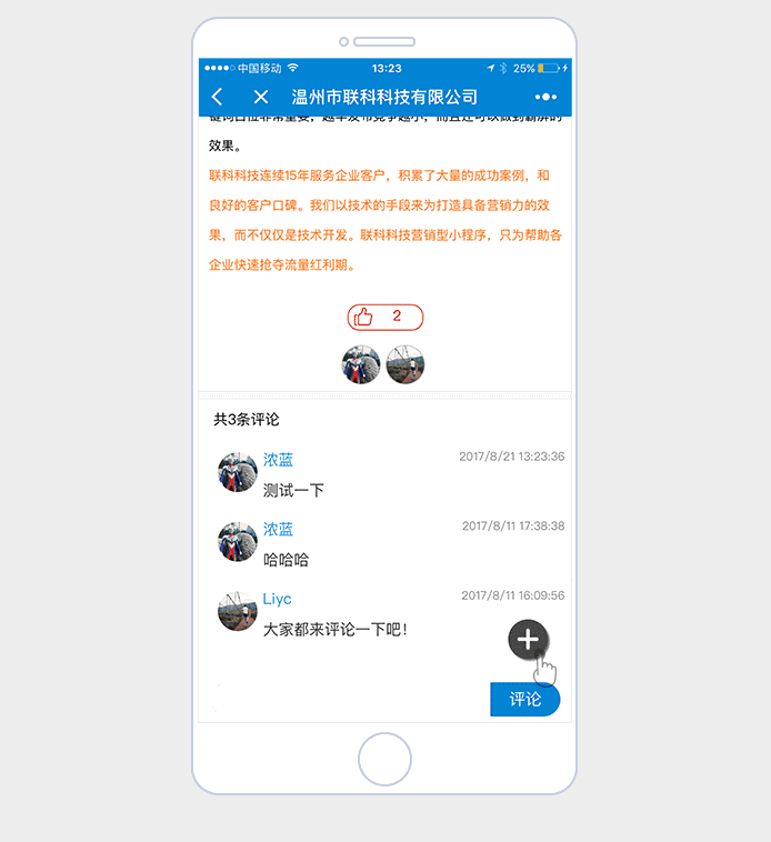 點(diǎn)擊快捷圖標(biāo)中的“分享”按鈕,馬上通過(guò)微信的分享功能,把所在的信息頁(yè)分享給微信中的好友或微信群,達(dá)到簡(jiǎn)便快速的傳播分享功能;