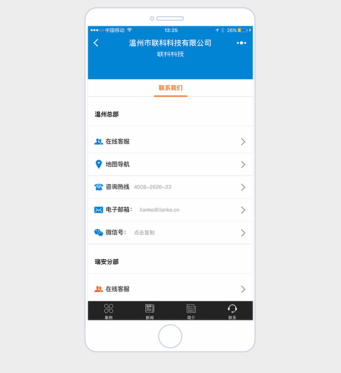 在聯(lián)系我們欄目中點(diǎn)擊“微信號(hào)”按鈕,快速?gòu)?fù)制微信號(hào),完成添加微信好友的功能,達(dá)到瀏覽者于企業(yè)平臺(tái)之間的直接對(duì)接,提高營(yíng)銷精準(zhǔn)度與好感度;
